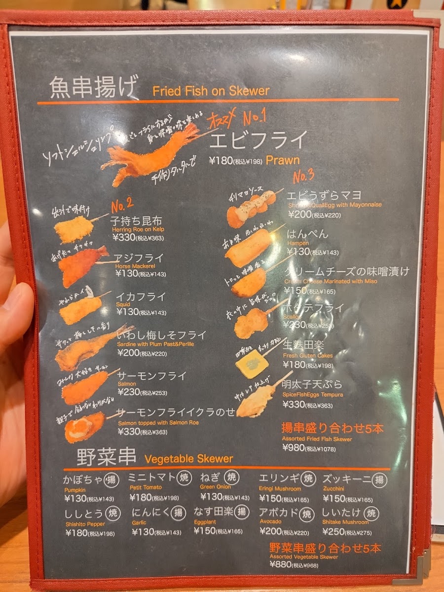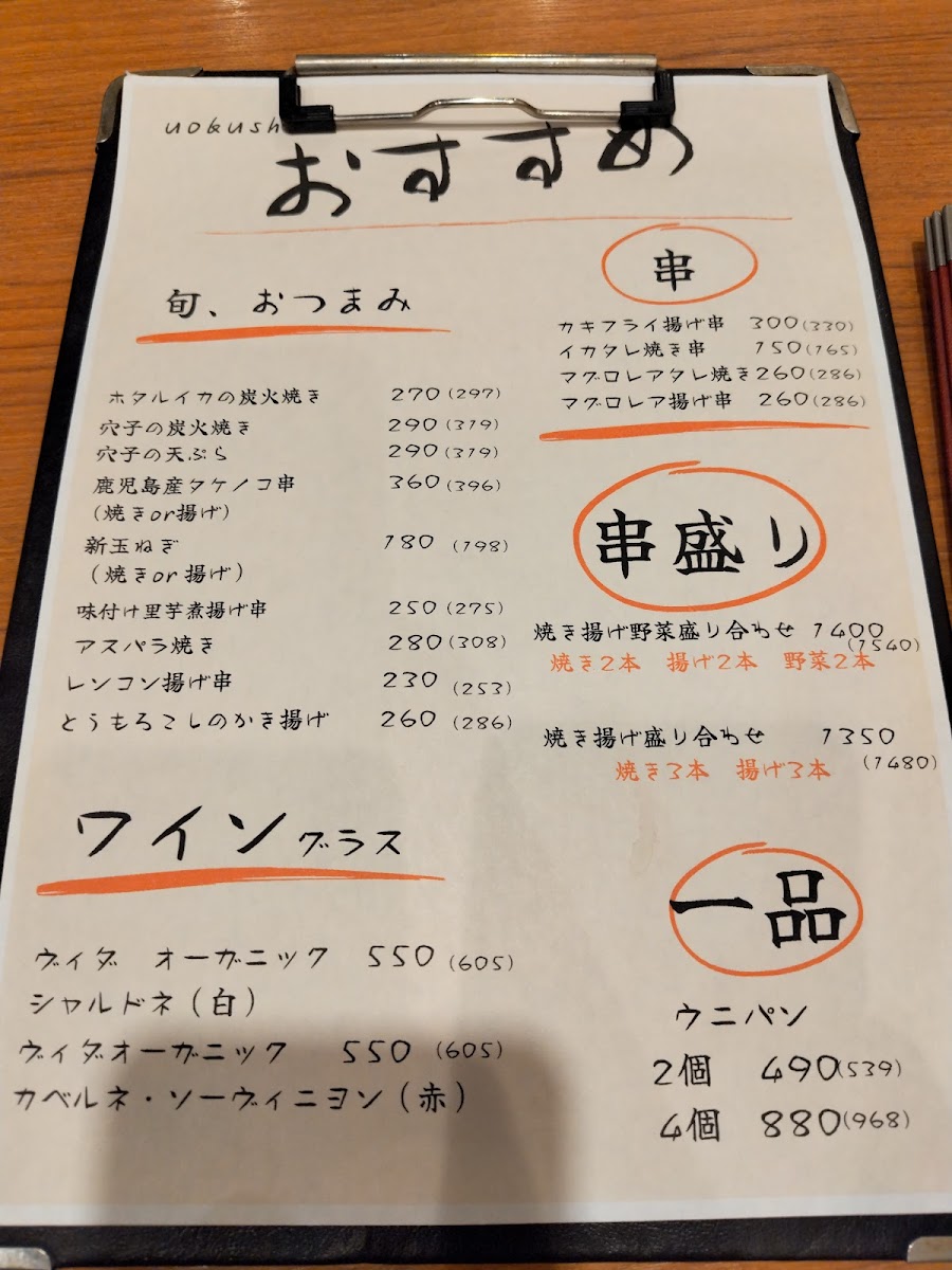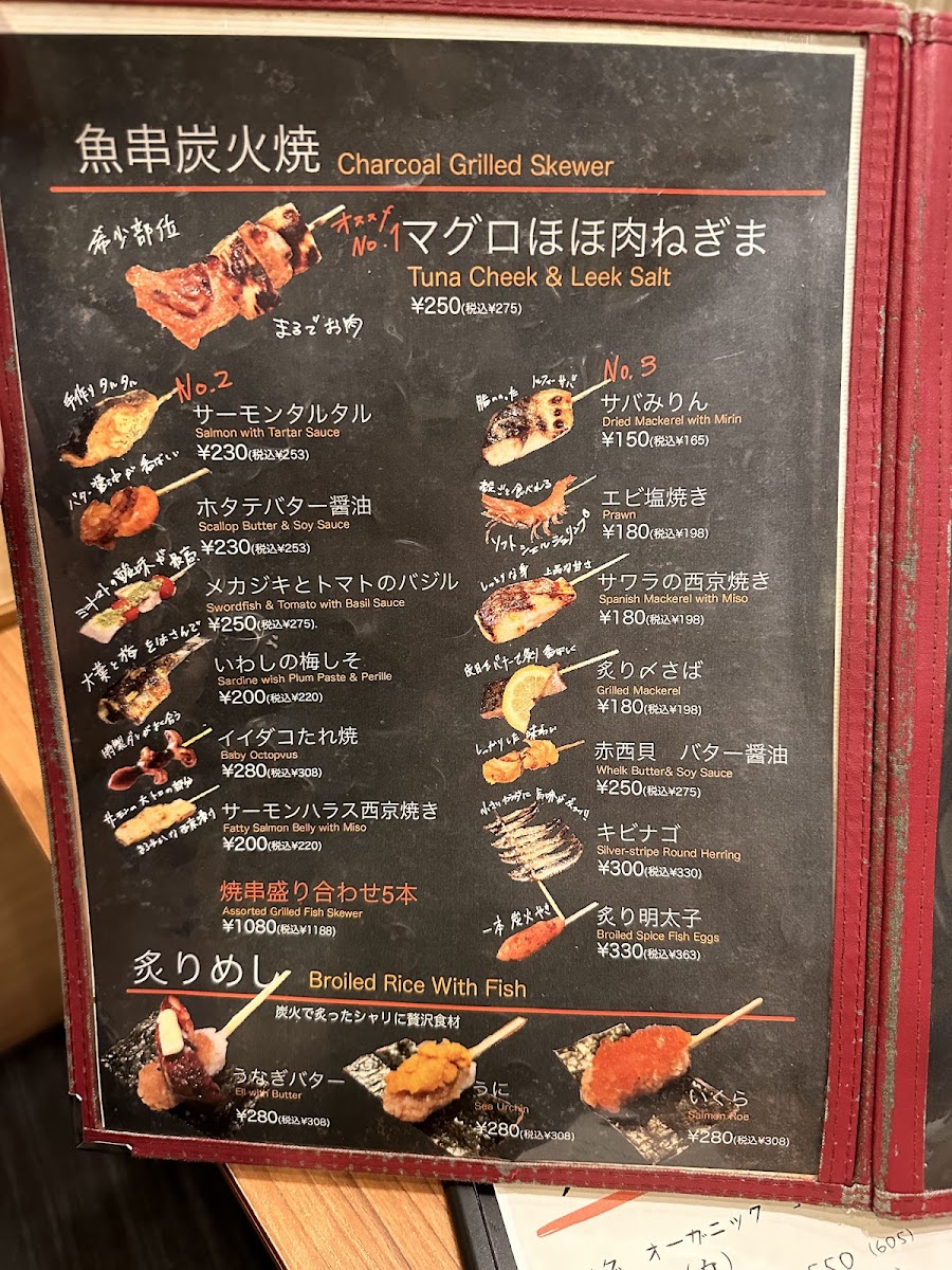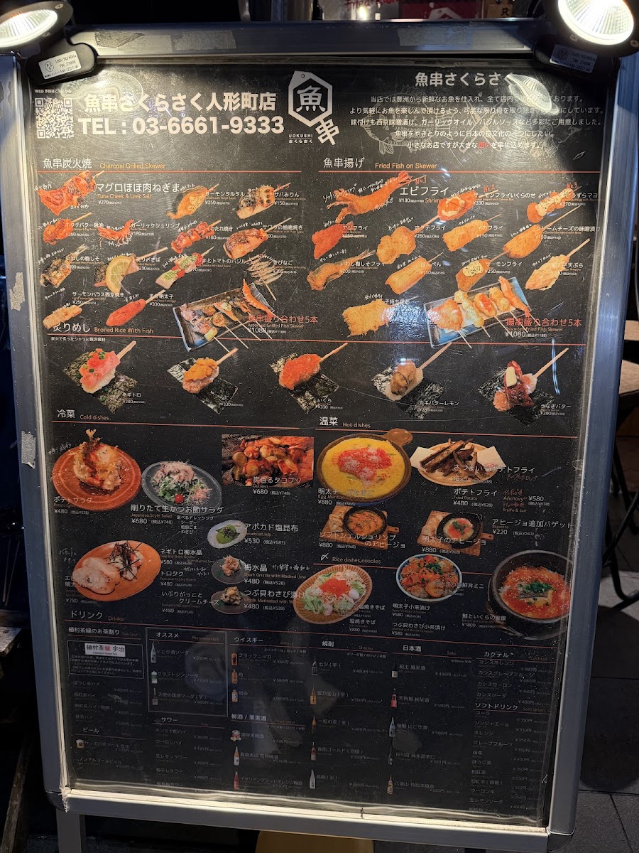As a final takeaway from my experience with the menu at Uokushisakurasaku Ningyocho Sohonten, what stands out most is its clear devotion to showcasing the natural flavor of seafood through thoughtful preparation rather than excess. The heart of the menu lies in the 魚串炭火焼, described as “炭火で香ばしく、魚の旨みをぎゅっと凝縮”-and that description feels entirely accurate. Each skewer carries a gentle smokiness from the charcoal, allowing the fish’s inherent umami to shine without being overpowered. For those who want a broader taste of this approach, the 焼串盛り合わせ5本 works perfectly as a sampler, offering variety while maintaining a consistent balance and quality across each piece. The menu then shifts smoothly into something more comforting with the 鮭といくらの釜飯(1~2人前), a donabe-style rice dish where tender salmon and rich salmon roe come together in a deeply satisfying, home-style presentation that feels both hearty and refined. To complement the food, the inclusion of 紀土 KID 純米酒 is a smart choice, as its clean and gentle profile pairs naturally with grilled fish and rice-based dishes. Taken as a whole, the menu may not be expansive, but it feels focused and confident-every item seems chosen to reinforce the restaurant’s identity. As a concluding impression, Uokushisakurasaku Ningyocho Sohonten delivers a menu that values simplicity, balance, and respect for ingredients, leaving a lasting sense of cohesion and authenticity rather than excess.
